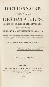 1818. LIBRO : (HISTORIA). DICTIONNAIRE HISTORIQUE DES BATAILLES SIÉGES, ET COMBATS DE TERRE ET DE MER, QUI ONT EU LIEU PENDANT LA RÉVOLUTION FRANÇAISE. Paris : Lib. Menard et Desenne, 1818. 4 vol. en 8º mayor.
