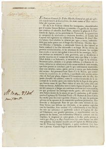 EL TRAIDOR SIMÓN BOLIVAR, Y REUNIDOS A LA GAVILLA DE FACCIOSOS QUE CONDUCE EL CABECILLA JOSEF PAEZ, ATACARON LA PLAZA DE SAN FERNANDO DE APURE, EN LAS PROVINCIAS DE VENEZUELA. LA GUARNICION SE COMPONIA DE SEISCIENTOS Y CINQUENTA HOMBRES, AL MANDO DEL CAPITÁN DEL REGIMIENTO DE INFANTERIA DE NUMANCIA D. JOSEF MARÍA QUERO [...]. Madrid 26 de octubre de 1818.