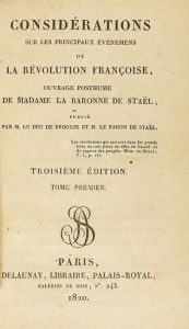 1820. LIBRO : (HISTORIA FRANCIA). STAËL, MADAME LA BARONNE DE : CONSIDÉRATIONS SUR LES PRINCIPAUX ÉVÉNEMS DE LA RÉVOLUTION FRANÇOISE. Paris : Libr. Delaunay, 1820. 3 vol. en 8º menor.