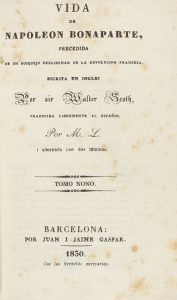1830. LIBRO : (HISTORIA-NAPOLEÓN). SCOTH, WALTER : VIDA DE NAPOLEÓN BONAPARTE PRECEDIDA DE UN BOSQUEJO PRELIMINAR DE LA REVOLUCIÓN FRANCESA. Barcelona : Juan y Jaime Gaspar, 1830. 9 vol. en 8º menor.