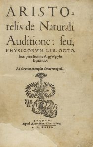 1543. LIBRO : (FILOSOFÍA). ARISTOTELIS : DE NATURALI AUDITIONE : SEU, PHYSICORUM LIB. OCTO. Lugdunum : Apud Antonium Vincentium, 1543. 8º menor.