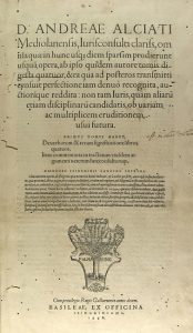 1558. LIBRO : ALCIATI, ANDREAE : D. ANDREAE ALCIATI MEDIOLANENSIS, IURISCONSULTI CLARIS OMNIA QUAE IN HUNCSQUE DIE, SPARSIM PRODIERUNT USQUAM OPERA, ab ipso quidem autore tomis digesta quatuor.... PRIMUS TOMUS HABET. Basilea : ex Officina...