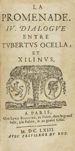 1663. LIBRO : (FILOSOFIA). LA PROMENADE. IV DIALOGUE ENTRE TUBERTUS OCELLA, ET XILINUS. Paris : Chez Lovis Billaine, 1663. 12º.