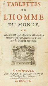 1715. LIBRO : (HUMANIDADES). TABLETTES DE L´HOMME DU MONDE OU analise des sept Qualitez essentielles à former le beau Caractére d´Homme du Monde accompli. Cosmopoli [La Haya] : Chez Auguste le Catholique, 1715. 8º menor.