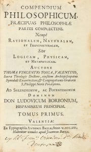 Antiguas anotaciones de anterior poseedor. Primera edición de la obra del intelectual Vicente Tomás Tosca (1851-1732), miembro destacado de la Academia de matemáticas el qual dió a luz este compendio filosófico, formado por tratados de lógica, metafísica, cosmologia... .