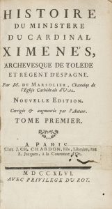 1746. LIBRO : (INQUISICIÓN). MARSOLIER : HISTOIRE DU MINISTERE DU CARDINAL XIMENES, ARCHEVESQUE DE TOLEDE ET REGENT D´ESPAGNE. Paris : chez Chardon, 1744. 2 vols. en 8º menor.