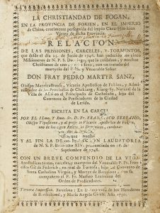 1750. LIBRO : (MISIONES). SERRANO, FRANCISCO : LA CHRISTIANDAD DE FOGAN, EN LA PROVINCIA DE FOKIEN, EN EL IMPERIO DE CHINA, CRUELMENTE PERSEGUIDA DEL IMPIO CHEU-HIO-KIEN VIRREY DE DICHA PROVINCIA. Relacion de las prissiones, carceles, y tormentos,...
