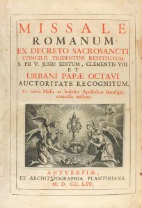1754. LIBRO : (RELIGIÓN). MISSALE ROMANUM EX DECRETO SACROSANCTI CONCILII TRIDENTINI RESTITUTUM... Antuerpiae [Amberes] : Architypographia Plantiniana, 1754. Folio menor.
