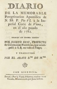 1783. LIBRO : (RELIGIÓN-PEREGRINACIÓN). DINI, JOSEPH : DIARIO DE LA MEMORABLE PEREGRINACION APOSTÓLICA DE N. SS. P. PIO VI À LA IMPERIAL CORTE DE VIENA, EN EL AÑO PASADO DE 1782. Barcel. : Viuda Piferrer, s.a. 8º menor.