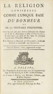 1787. LIBRO : (FILOSOFÍA). SILLERY, MARQUISE DE : LA RELIGION DONSIDÉRÉE COMME L´UNIQUE BASE DU BONHEUR ET DE LA VÉRITABLE HILOSOPHIE. Orleans : Imp. Couret de Villeneuve, 1787.