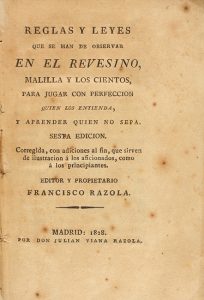 1828. LIBRO : (JUEGOS). REGLAS Y LEYES QUE SE HAN DE OBSERVAR EN EL REVESINO, MALILLA Y LOS CIENTOS... Madrid : Imp. Don Julian Viana Razola, 1828. 8º menor.