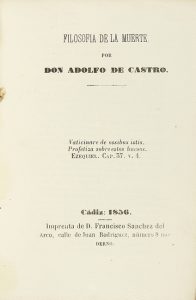 1856. LIBRO : (FILOSOFÍA). CASTRO, ADOLFO DE : FILOSOFIA DE LA MUERTE. Cádiz : Imp. D. Francisco Sanchez del Arco, 1856. 8º menor.