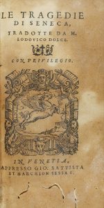 1560. LIBRO : (LITERATURA). LE TRAGEDIE DI SENECA, TRADOTTE DA M. LODOVICO DOLCE. Venetia : Imp. Gio. Battista, 1560 [en colofón]. 8º menor.