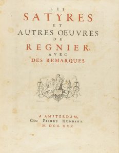 1730. LIBRO : (LITERATURA SATÍRICA). REGNIER, MATHUIN : LES SATYRES ET AUTRES OEUVRES DE... AVEC DES REMARQUES. Amsterdam : Chez Pierre Humbert, 1730. 4º mayor.