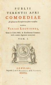 1751. LIBRO : (LITERATURA CLÁSICA). TERENTII AFRI, PUBLII : COMOEDIAE. Londini : Imp. J. et P. Knapton, 1751. 2 vol. en 4º menor.