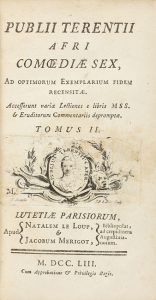 1753. LIBRO : (LITERATURA CLÁSICA). TERENTII AFRI, PUBLII : COMEDIAE SEX, AD OPTIMORUM EXEMPLARIUM FIDEM RECENSITAE. Lutetiae Parisiorum [París] : Ed. Natalem le Loup & Jacobum Merigot, 1753. 2 vol. 8º menor.