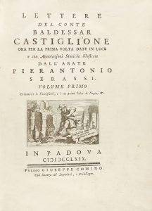 1769. LIBRO : (LITERATURA). CASTIGLIONE, BALDESSAR : LETTERE DEL CONTE BALDESSAR CASTIGLIONE ORA PER LA PRIMA VOLTA DATE IN LUCE A VON ANNOTAZIONI STORICHE ILLUSTRATE DALL´ ABATE PIERANTONIO SERASSI. Padova : Imp. Giussepe Comino, 1769. 4º.