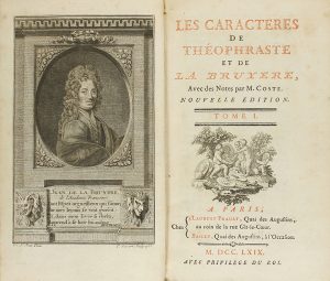 1769. LIBRO : (LITERATURA). LES CARACTERES DE THÇEOPHRASTE ET DE LA BRUYERE. Paris : Laurent Prault y Bailly, 1769. Dos vol. en 8º menor.