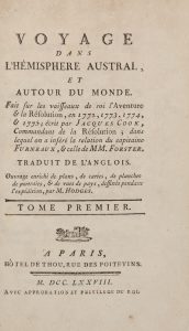 Cook James, Voyage dans l'hémisphere austral, et autour du monde, fait [...] en 1772, 1773, 1774, & 1775 [...] dans lequel on a inséré la relation du capitaine Furneaux, & celle de Forster [...] Tome premier (-sixième). A Paris: Hotel de Thous...