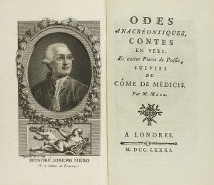 1781. LIBRO : (LITERATURA FRANCESA). MERO, HONORÉ JOSEPH : ODES ANACRÉONTIQUES, CONES EN VERS, ET AUTRES PIECES DE POÉSIE. Londres : s. imp., 1781. 12º.