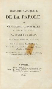 1816. LIBRO : (LINGÜÍSTICA). GÉBELIN, COURT DE : HISTOIRE NATURELLE DE LA PAROLE, OU GRAMMAIRE UNIVERSELLE... Paris : Ed. Plancher, 1816. 8º mayor.