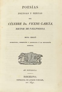 1830. LIBRO : (LITERATURA). GARCIA RECTOR DE VALLFOGONA, VICENS : POESÍAS JOCOSA Y SERIAS DEL CÉLEBRE... Barcelona : Imp. Joseph Torner, 1830. 8º mayor.