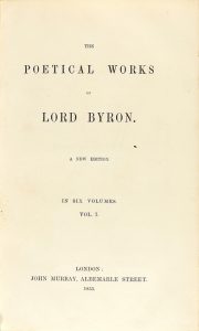 1856. LIBRO : (LITERATURA INGLESA). BYRON, LORD : THE POETICAL WORKS. Londres : John Murray, 1855-1856. 6 vol. en 4º menor.