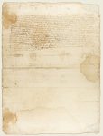 Con cerco de humedad y pérdida en la esquina superior derecha, que se ha llevado las últimas palabras de la primera línea en el documento firmado por el rey.