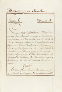 Número 1. Capitulaciones matrimoniales para contraerle Domingo de Castañeda, hijo del Licenciado D. Pedro de Leon y de Da. Ysabel de Cuero su Muger, sobrino de Bartolome Ruiz de Castañeda Srio. De Ss. Ms., con Da. Beatriz de Santillana, hija legítima de D. Diego Gonzalez de Santillana y Da. Francisca Rodriguez su Muger. En Medina del Campo en 20 de Marzo de 1531. 1 h. + 6 p. manuscritas con la firma del escribano Antonio Ruiz Enebro.