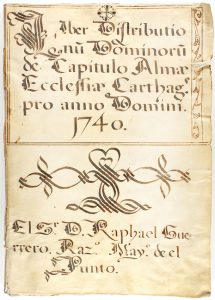 1740. MANUSCRITO : (PATRIMONIO-CARTAGENA). LIBER DISTRIBUTIO & DOMINORUM DE CAPITULO ALMAE ECCLESSIAE CARTHAG. PRO ANNO DOMINI 1740. Manuscrito sobre papel en gran folio. 48 h.