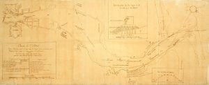 ► Interesante y raro mapa manuscrito de la parte del río desde la ciudad de Bayonne hasta su desembocadura, con todos los diques de nuevo construídos, y una sección de su construcción, también figuran diversas edificaciones a lo largo del río, como la antigua Abadía de las religiosas de San Bernard.