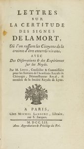 1752. LIBRO : (MEDICINA). LETTRES SUR LA CERTITUDE DES SIGNES DE LA MORT... Paris : Libr. Michel Lambert, 1752. 8º menor.