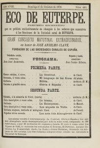 1864-1910. REVISTA : (MÚSICA). ECO DE EUTERPE. Periódico dedicado esclusivamente á los señores concurrentes á los Campos Eliseos. 2 VOL. Barcelona : Imp. Sucesores de N. Ramírez, 1864-1879. 8º mayor.