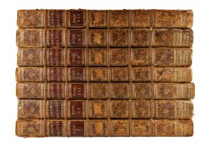 7 volumi in-folio (mm 400x255). Pagine [4], XXVIII, 216, [2] di indice, 217-383, [4] + 1 antiporta e 29 carte di tavole, 2 delle quali a doppia pagina e 1 a doppia pagina e più volte ripiegata; [6], 468, [4] + 38 carte di tavole, 3 delle quali a doppia pagina e 2 a doppia pagina più volte ripiegate; [4], 422, 2 bianche + 19 carte di tavole, 5 delle quali a doppia pagina; [4], 414, 2 bianche + 13 carte di tavole, 5 delle quali a doppia pagina; [4], 430, 2 bianche +41 carte di tavole, 8 delle quali a doppia pagina e 1 a doppia pagina più volte ripiegata; [4], 453, [3] + 44 carte di tavole, 5 delle quali a doppia pagina; [4], 427, 1 bianca + 41 (di 42) carte di tavole; manca la tavola n. 27. Con nel complesso 1 antiporta e 223 figure (di 224) in 225 carte di tavole (di 227), di cui 27 a doppia pagina e 4 anche più volte ripiegate. Esemplare con bruniture diffuse in alcuni volumi ma discreto; strappi marginali a una tavola e arrossature con corrosione della carta a poche pagine del primo volume, tarlo alle prime carte, 1 tavola macchiata e 1 tavola restaurata al margine nel quinto volume. Legatura settecentesca in piena pelle maculata con piatti inquadrati da cornice di triplice filetto impressa in oro, titoli dorati entro tasselli al dorso a 6 nervi. Legatura lisa. Ex-libris Bruno Cammarella ai contropiatti. Celebre opera, famosa per le belle incisioni realizzate su disegni di Picart. Questa edizione si basa su quella pubblicata ad Amsterdam nel 1723-43, ma con i testi rivisti e ampliati degli abati Banier e Le Mascrier sulla base delle nuove informazioni che giungevano loro dalle varie missioni cattoliche. Le illustrazioni invece riprendono in larga parte quelle dell'edizione olandese. Cfr. Brunet I, 1743: «Cette édition a été publiée sous la direction littéraire de l'abbé Banier; mais le texte, tantôt entièrement refait, tantôt simplement corrige, es dû à l'abbé Lemascrier, ainsi que le nouvelles dissertations»; Cohen-Ricci 135; Hiler 708; Lewine 414; Sander 1548.