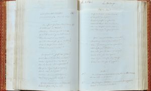 janséniste rouge, dos à nerfs, dentelle intérieure (Capé). Cachet de la collection Debauve. Important manuscrit des dernières chansons de Béranger. Elles furent publiées après la mort de l’auteur, qui avait solennellement promis en 1833 de ne plus en composer, mais qui pourtant ne cessa d’en écrire, sans les publier, et les donna à son éditeur Perrotin. Le manuscrit présente des ratures et corrections, ainsi que des variantes, parfois importantes, avec le texte définitif publié en 1869 sous le titre Dernières chansons de Béranger de 1834 à 1851. Ont été reliés en tête 2 portraits et 2 lettres.Provenance : bibliothèque Sickles (n° 6179).