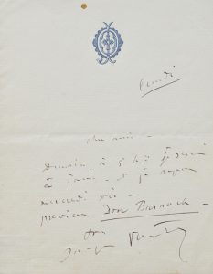 JACQUES OFFENBACH. Billet A.S. 1 p. in-16 à son chiffre gravé. Cachet de la collection Debauve. Il annonce son arrivée à Paris pour le lendemain à 5h et son départ le jour d’après. « Préviens Don Busnach ».