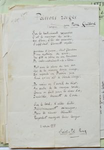 « L’arracheur d’heures » dédié à Edmond Pilon, fragment du troisième tome des Reposoirs de la procession (3 pp. in-4, incomplet de la fin). Poème « Le Palais d’Ithaque » signé « Paul Roux » (1 p. in-4, [1885]). Quatrième page (seule) d’un manuscrit contenant « la Fonte de l’albâtre », écrit du château d’Arville en Belgique. Poème « Chasse à courre » portant le cachet du Mercure de France (9 fév. 1888, 1 p. in-folio)