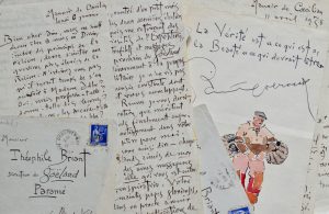 moment où Théophile Briant s’installe à Paramé et lance Le Goéland. « Votre Goéland s’envergure de maintes pages glorieuses, si bien qu’on le verra dans un proche avenir planer parmi les meilleures grandes publications de votre époque. Jean des Cognets, comme tant d’autres, prévoyons un tel épanouissement. Il importe donc que, de votre premier concours, date un appareillage pour l’Immensité vierge qui plus que jamais se déclare dans ce menu globe que les poëtes libérés portent sur leurs épaules tel un monde originel, je dis originel car le poëte est un commencement […] ». Sa dernière lettre, d’une écriture déjà fatiguée, est écrite au début de la guerre, il est malade, ruiné, sollicite son ami pour une aide financière, mais continue à avoir des projets d’écriture. « Mon rêve est de réveiller ma vieille plume et de recouvrer mon équilibre en songeant aux miens. Si je m’écoutais, je déchirerais ces pages désastreuses, mais je vous les livre quand même en mon destin. Ici nos pensées constantes sont pour nos bien-aimés soldats de France […]. Que Dieu protège notre France immortelle […] ». Sont joints : 1 dessin original de SPR à la mine de plomb « Camaret est une pierre dans le vent sur une lyre » et une devise A.S. de SPR tracée en haut d’un dessin aquarellé signé du poète camarétois Jim Eugène Sévellec (1897/1971) représentant un pêcheur : La Vérité est « ce qui est », la Beauté « ce qui devrait être ».