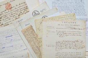 masqués, le théâtre scolaire. Intéressant ensemble concernant le théâtre Feydeau et le théâtre de l’Opéra sous la Révolution (dont 2 lettres de Merlin de Douai). Très intéressant dossier de 3 pièces sur la réouverture du théâtre de l’Odéon (1797). Lettre de la Commune de Paris concernant le théâtre de l’Estrapade (1793). Lettre de Roederer à Mahérault au sujet d’une représentation au Théâtre-Français (an 10). Extrait du registre des délibérations de la section du Palais-Royal sur la surveillance des spectacles (1791). Ensemble d’une quarantaine de programmes des théâtres de Paris de juin à août 1791. Lettre circulaire de Sotin sur la police des spectacles (an 6). Dossier de 6 pièces diverses sur Charles Simon Favart et sa famille. Ainsi qu’un petit ensemble de lettres et portraits gravés de comédiens du XVIIIe dont une L.S. de Mlle de Montansier au duc de Gaëte (1811).