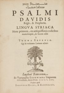Psalmi Davidis Regis, & Prophetae, lingua syriaca [...] in lucem editi à Thoma Erpenio qui & versionem Latinam adjecit. Lugduni Batavorum: Ex typographia Erpiana [...] prostant apud Iohannem Maire, & Elzevirios, 1625.