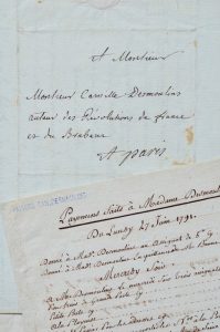 Bel et intéressant ensemble de lettres de patriotes de Province et de Paris sur les événements révolutionnaires, certaines en vue de relater leur témoignage dans le journal de Camille Desmoulins, les Révolutions de France et de Brabant. Camille Campmas (Pontivy 1790), lui racontant qu’on a voulu l’empêcher de lire le dernier numéro de son journal sur la place publique. Bernier, chargé d’affaires des ducs de Chartres et de Montpensier, demandant le réabonnement à son journal au nom des deux ducs (Palais Royal juin 1790). Un « ami de la liberté » de Marseille l’informe du nouvel épitaphe qui sera gravé sur la pierre angulaire de la citadelle de Saint-Nicolas (juin 1790). Alexandre Créquy [probablement Charles de Bourbon-Montmorency] : poignante lettre écrite de la prison de Sainte-Pélagie le 19 nivôse an 2 : « L’imprimé cy inclus et le peu de paroles que te dira de bouche mon infortunée et chère épouse, suffiront pour te faire connaître toute l’étendue et toute l’horreur de notre triste sort non mérité : tes imprimés, tes vertus républicaines et tes liaisons d’amitié avec Robespierre et tous les vrais bons Républicains, me suffisent pour m’inspirer la confiance que tu daigneras être l’avocat officiel, le protecteur, le défenseur et le mentor de ton affectionné concitoyen […] », etc. Avec une lettre de 1784 adressée à monsieur Desmoulins « juriste au collège de Louis le grand ».