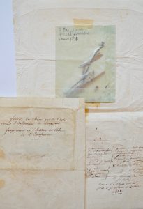 l’habitation de Longwood - fragment de boiserie du Cabinet de l’Empereur ». 2. « Plantes rapportées de Ste Hélène 4 mars 1838 ». Géranium sur le tombeau même de Napoléon cueilli à ses pieds. Feuille de pêcher devant la chambre de Longwood, planté p.l.m. Bois de la chambre à coucher et de la salle de réception. Un morceau du mur de son foyer. Morceau de l’ancien saule couché sur le tombeau. Espèce d’if autour du tombeau. Espèce de myrrhe autour de la source ». «Tous ces objets ont été pris à Ste Hélène le 4 mars 1838 ».