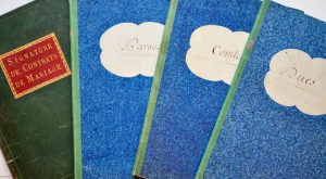 barons du premier Empire, réalisés probablement entre 1808 et 1809. Il est joint un registre in-4 (par Magnier papetier à Paris) relié en plein maroquin vert, portant 2 pièces de titre en maroquin rouge « Signature de contrats de mariage », époque premier Empire. Seules les 8 premières pages sont remplies, de mai 1811 à juin 1815 où sont consignés les mariages (civils et militaires) de grands dignitaires de l’empire.