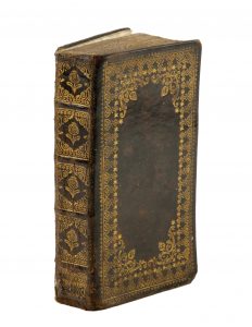 In-12° lungo (mm 138x70). Pagine 480. Vignetta xilografica al frontespizio, frontespizio e testo stampati in rosso e nero. Lieve gora d'acqua al margine esterno delle carte. Bellissima legatura muta coeva in piena pelle con piatti inquadrati da una ricca cornice di filetti misti a motivi fitomorfi, geometrici e stelle impressa in oro; ampie decorazioni impresse in oro anche ai comparti del dorso a 4 nervi. Tagli dorati e cesellati. Si vende come legatura.