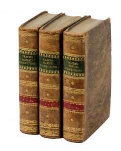 6 tomi in 3 volumi in-8° (mm 184x116). Pagine [4], 100, 96, 88, 2 bianche, 25-26, 2 bianche, 82, 2 bianche; [2], 95, [1], 96, 106, 2 bianche; [20], 126, 2 bianche, VIII, 74 [i.e. 72], 8, 103, 1 bianca; [2], XVI, 72, [4], 91, 1 bianca, [4], 100, 84; [2], 123, 1 bianca; 128, 124, 18; [2], 135, 1 bianca, 131, 1 bianca, 140, [2]. Ciascuna commedia ha numerazione autonoma e un proprio frontespizio con marca e motto dell'Accademia della Crusca. Esemplare in ottime condizioni, con solo sporadiche lievi fioriture a poche carte e con un taglio in una delle due carte o7 del primo volume (doppia nel nostro esemplare). Legatura settecentesca in mezza pelle maculata con punte e piatti marmorizzati, titoli impressi in oro su tasselli applicati ai dorsi. Minimi difetti. Ex-libris applicato ai contropiatti anteriori, nota di possesso manoscritta ai fogli di guardia, nota di possesso cancellata al frontespizio del secondo tomo. Rara raccolta delle più celebri commedie in prosa e poesia del Rinascimento fiorentino, una delle quali è qui in prima edizione: L'arzigogolo del Lasca. La nostra copia è una delle rarissime complete, per avere la duplice versione della pagina 26 (carta o7) della commedia Gl'incantesimi: «il foglietto genuino [non censurato, Ndr.] quanto il ristampato; il primo a suo luogo naturale, il secondo è [...] in fine» Razzolini-Bacchi della lega 346-47. I primi due tomi sono dedicati alle opere di Giovanni Maria Cecchi: (I tomo) La dote, La moglie, Gl'incantesimi, La stiava; (II tomo) I dissimili, L'assiuolo, Il servigiale. Il terzo e quarto tomo raccolgono le commedie di Anton Francesco Grazzini detto il Lasca: (III tomo) La Gelosia, La spiritata, I parentadi; (IV tomo) La strega, La sibilla, La pinzochera, L'arzigogolo. Il quinto tomo contiene le opere di Francesco D'Ambra: Il furto, I Bernardi, La cofanaria; Descrizione degl'intermedj rappresentati colla commedia nelle nozze... Il sesto tomo contiene le commedie Il granchio e La spina di Leonardo Salviati, e La Tancia di Michelagnolo Buonarroti. Cfr. Brunet V, 687; Gamba 991; Graesse VI, 2; Parenti 89.