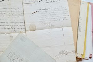 FAMILLE BRETONNES. Plus d’une centaine de documents, XVI e - XIX e s. (principalement du XVIII e ), classés par dossiers. Cachet de la collection Debauve sur tous les documents. Lettres, affiches, mémoires, et ...