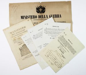 Testi a stampa. Dimensioni varie. Il “Manifesto del magistrato”, datato 7 dicembre 1796 – stampato a Torino, richiama «alla più stretta osservanza coll’aggiunta di più gravi pene, varie provvidenze già date, e se ne aggiungono altre per riparare ai danni della contagiosa malattia delle Bovine» (8 pagine). La “Notificazione” del 10 febbraio 1818 – stampata a Rovigo, è relativa ai «cinque stalloni erariali spediti […] a fecondare le cavalle di questa provincia […]. Col primo del veniente marzo gl’indicati stalloni saranno collocati nella stalla […] e i proprietari delle cavalle dovranno rivolgersi a questo […] Comando Militare […] onde ottenere le necessarie istruzioni perché sieno ammesse alla monta […]». Le 4 Circolari del 1820 (stampate a Rovigo, una con note manoscritte) sono relative a furti o a ritrovamento di cavalli e di sedioli. Le 2 carte di fine XIX secolo (uno è un manifesto) sono relative ad un’asta e a un concorso di puledre. Il manifesto del 1873 è un “Avviso” del Ministero della Guerra relativo all’acquisto di circa mille cavalli da per l’Esercito, mentre il manifesto del 1922 (di grandi dimensioni) informa che nella Regia Stazione Ippica di Bobbio saranno disponibili due cavalli per la monta (con orari e tasse di pagamento).