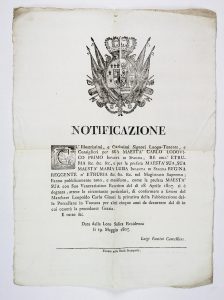 Manifesto. Notificazione per 'confermare [...] al Marchese Leopoldo Carlo Ginori [...] la fabbricazione delle porcellane in Toscana. Firenze, Reale Stamperia'. Datato 19 maggio 1807.