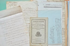 port, lettres de Maurepas, Dalbarade, Bourdon de Vatry, Decrès, Dupetit-Thouars, baron de Mackau, duc d’Aiguillon, etc., petite brochure révolutionnaire imprimée à Lorient : « Signaux pour les mots d’ordre à l’usage des armées de la République française », comptes de fret de navire XVIIIe, lettre écrite du bagne de Lorient (1819), ensemble de chansons de marins, manuscrit d’un « Manuel du marin fusilier » (30 pp. in-folio), comptes, lettres de marins écrites de Lorient, Hennebond et Sarzeau, ordonnance du roi (1781), etc.