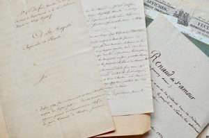 Chevalier, Brémond d’Ars, Sophie de Lanthénas, Emile Péhant, l’abbé Gaspard-Marie Brossier, Louis Dufeu (dont une à Napoléon), Mme Renaud de Saint-Amour, général Bedeau (1848), Ferdinand Favre (1851), Léon Bureau, etc. Imprimés, lettres commerciales, lettres circulaires, passeports, étiquettes commerciales, lettre sur la répression à Nantes en 1852, rares petits imprimés nantais (historiques, littéraires et politiques), reçus de sociétés savantes, factures d’imprimeurs nantais, prix courants de marchandises, connaissements maritimes, factures à en-têtes de commerces nantais, contrats, documents sur l’enseignement, lettres sur les industries nantaises (sardines, biscuiteries), etc. ainsi qu’un manuscrit sur l’émigration par Sallion de Nantes, écrit vers 1824 « De l’émigration et principalement de celle des français royalistes pendant la révolution de 1790 par M.B.S. » (63 pp. in-8).
